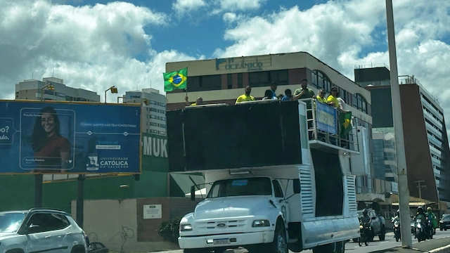 O ato começou no Parque dos Ventos e seguiu pela orla, liderado por um trio elétrico. Atrás, cerca de 30 carros e motos, todos com bandeiras do Brasil, causaram lentidão no trânsito.