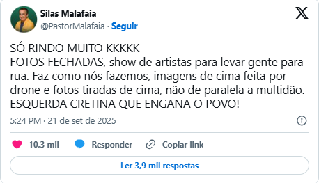 “Só rindo muito. Fotos fechadas, show de artistas para levar gente para rua. Faz como nós fazemos, imagens de cima feita por drone e fotos tiradas de cima, não de paralela a multidão”, escreveu o pastor Silas Malafaia no X, antigo Twitter.