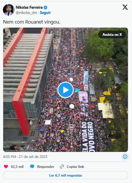 O deputado federal Nikolas Ferreira também ironizou a presença de artistas nas manifestações. “Nem com Rouanet vingou”, publicou o parlamentar, juntamente com um vídeo de drone que mostra imagens aéreas da manifestação na Avenida Paulista.
