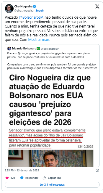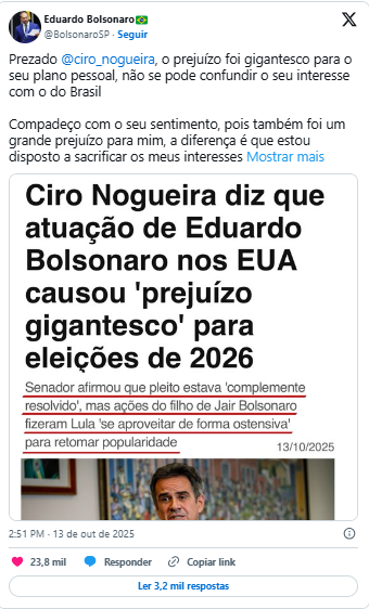 “Prezado Ciro Nogueira, o prejuízo foi gigantesco para o seu plano pessoal; não se pode confundir o seu interesse com o do Brasil. Compadeço-me do seu sentimento, pois também foi um grande prejuízo para mim. A diferença é que estou disposto a sacrificar os meus interesses pessoais pelo Brasil”, escreveu Eduardo em seu perfil no X, antigo Twitter.