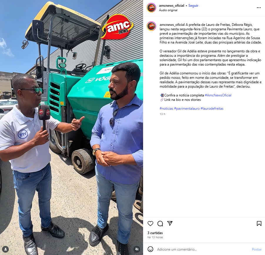 Gil de Adélia comemorou o início das obras: “É gratificante ver um pedido nosso, feito em nome da comunidade, se transformar em realidade. A pavimentação dessas ruas representa mais dignidade e mobilidade para a população de Lauro de Freitas”, declarou.