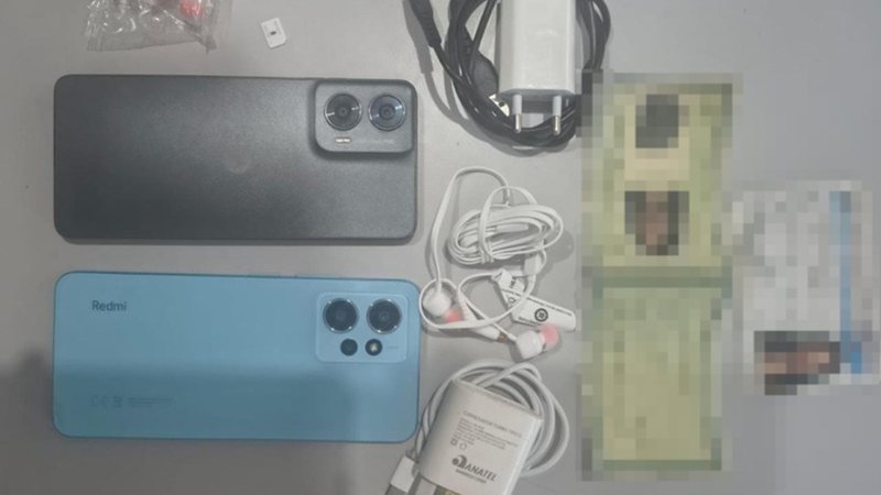Dois celulares, dois carregadores, um chip e fones de ouvido foram apreendidos com o policial, além de comprimidos.