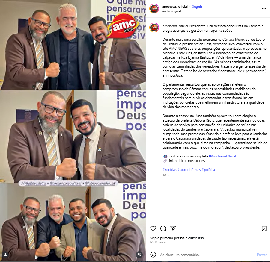 Durante mais uma sessão ordinária na Câmara Municipal de Lauro de Freitas, o presidente da Casa, vereador Juca, conversou com o site AMC NEWS sobre as proposições apresentadas e aprovadas no plenário. Entre elas, destacou-se a indicação da construção de calçadas na Rua Djanira Bastos, em Vida Nova — uma demanda antiga dos moradores da região. “As minhas caminhadas, assim como as caminhadas dos vereadores, trazem pra gente esse dia de apresentar. O trabalho do vereador é constante, ele é permanente”, afirmou Juca.
