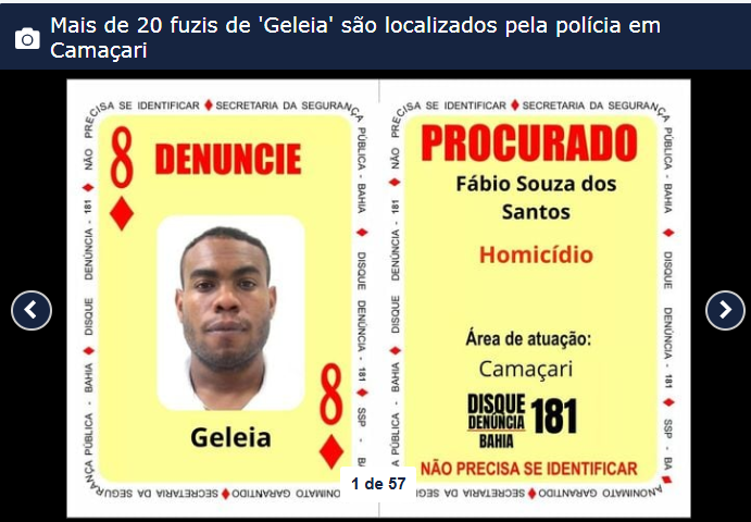 As armas estavam enumeradas, para facilitar o controle do dono. Os 22 fuzis apreendidos pela polícia em um bunker em um sítio de Camaçari, na Região Metropolitana de Salvador, no último dia 19, pertencem ao traficante Fábio Souza dos Santos, o ‘Geleia’, que estampa hoje a carta ‘Oito de Ouros’ do Baralho do Crime. Ele é uma das lideranças do Bonde do Maluco (BDM).